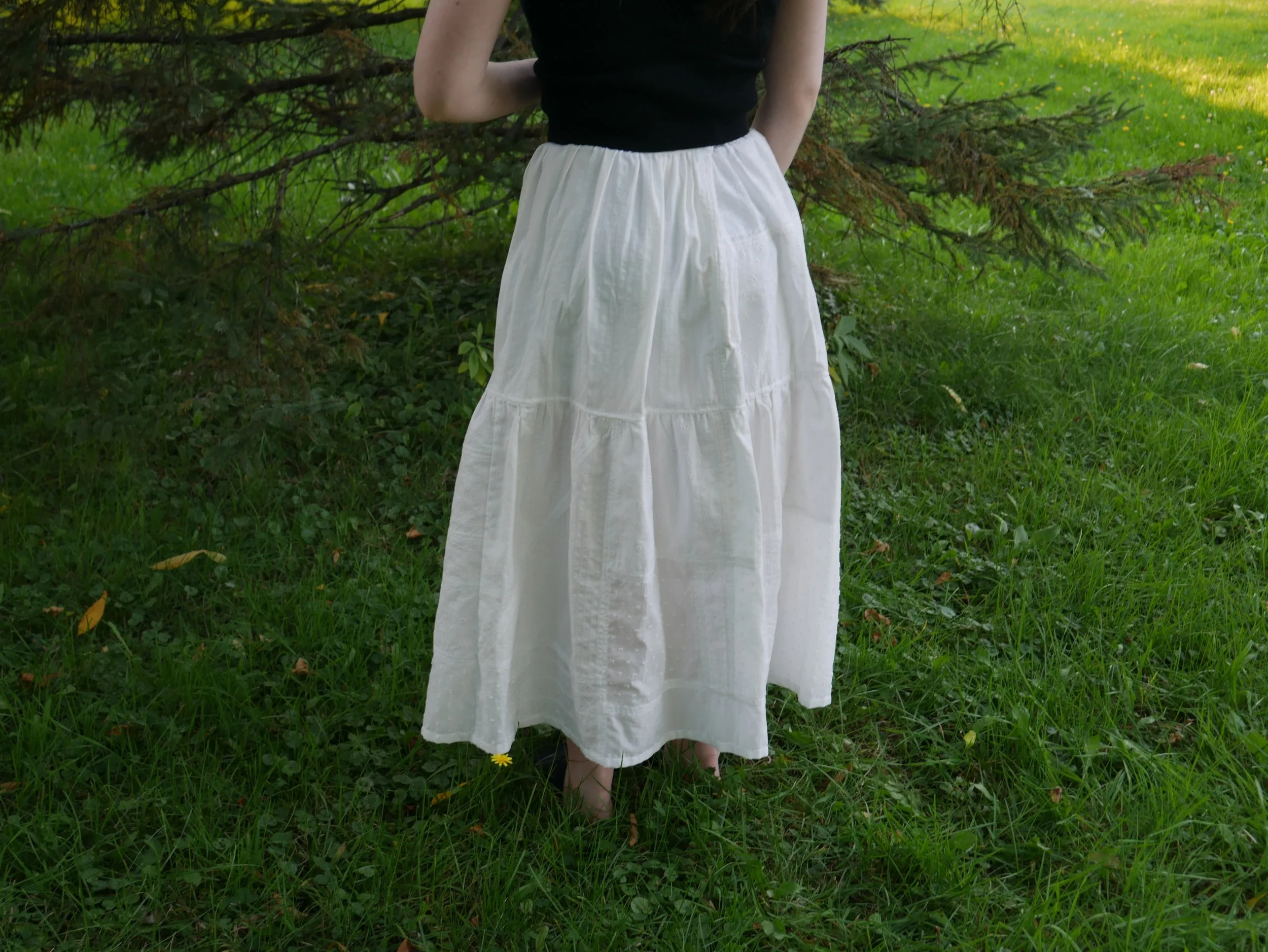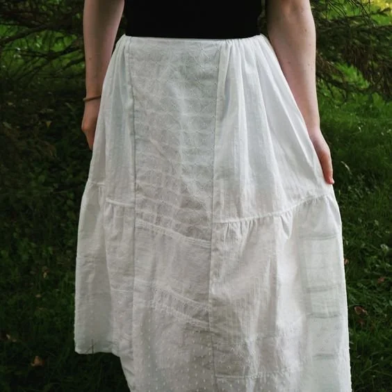 Suivant la grosse tendance de l’été pour les jupes longues et blanches qui évoquent un jupon ancien, j’ai décidé de ressortir un patron que j’avais créé il y a environ deux ans mais que je n’avais jamais publié. Bien que ma version - avec son devant plat et l’ampleur dirigée vers l’arrière - est plutôt inspirée du jupon de la Belle époque que des jupons du XVIIIième et XIXième siècles qui ont inspiré la tendance de cet été, elle convenait parfaitement à l’utilisation de retailles de tissu.