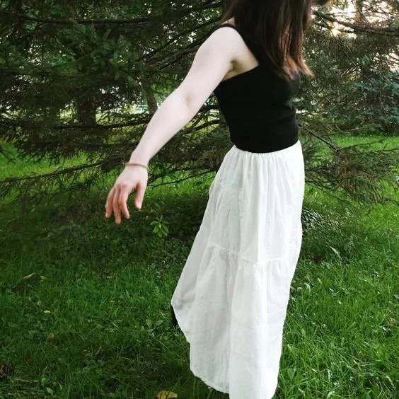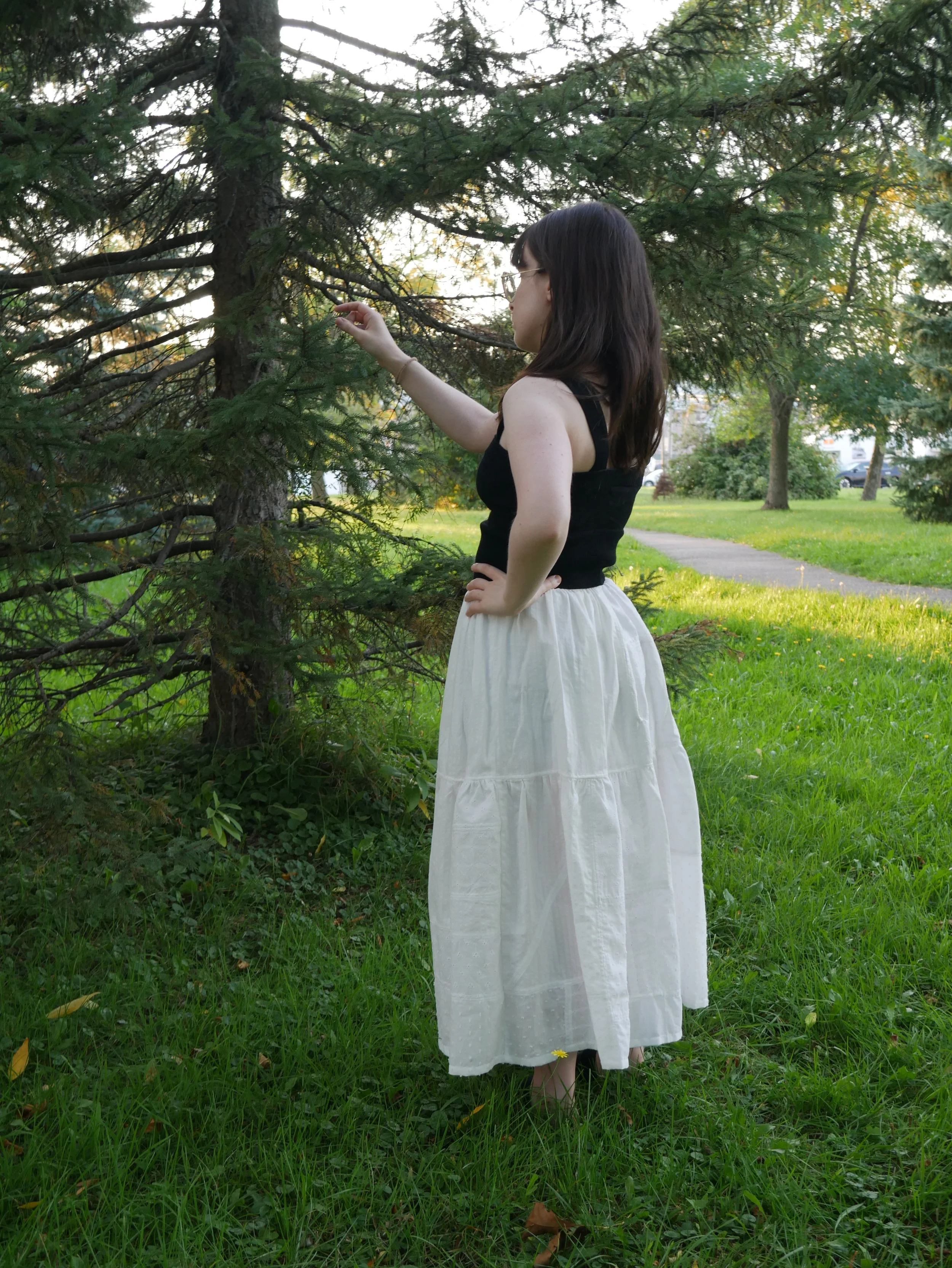 Je vous présente aujourd’hui mon second projet du mois de juillet (oui, je suis en retard) qui était une version de ma jupe Marilla cousue dans des retailles de broderie anglaise, voile de coton et plumetis de coton.